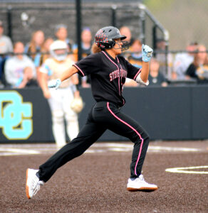 - Andrew Grimm ON THE RUN — Big Red’s Sadie Edwards runs to second base for a double after sending the ball off the wall.