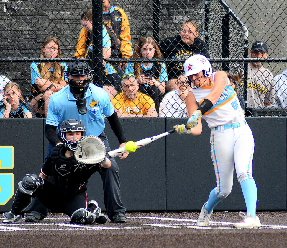 - Andrew Grimm CONNECTING — Oak Glen’s Danica Holden gets her bat on the ball for one of her three singles against Big Red.