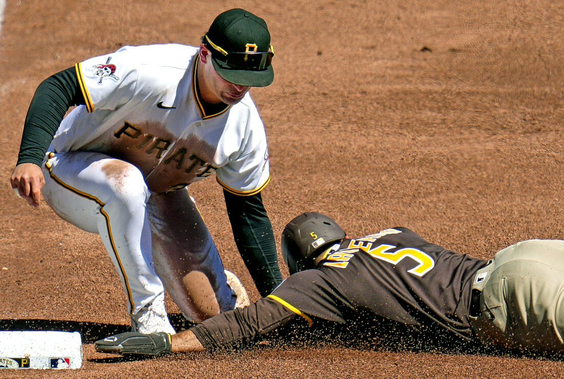 Associated Press The Padres' Ramón Laureano gets into third ahead of the tag by Pirates third baseman Nick Yorke during the sixth inning of a game in Pittsburgh, Wednesday.