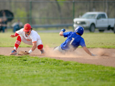 - Andrew Grimm SLIDING — Harrison Central’s Lance Smith slides into second base while Creek’s Max Lane looks to apply a tag.