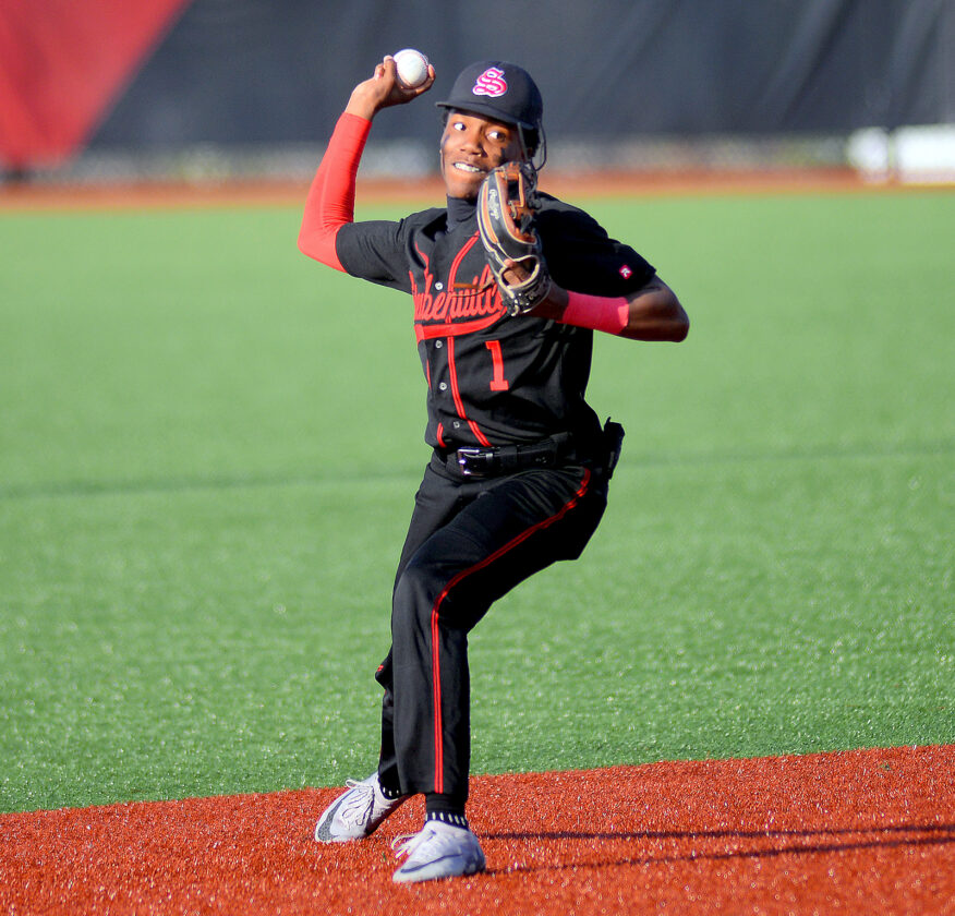 Andrew Grimm MAKING THE PLAY — Big Red shortstop Royal Mayo fires to third to get the lead runner after knocking down a ground ball.