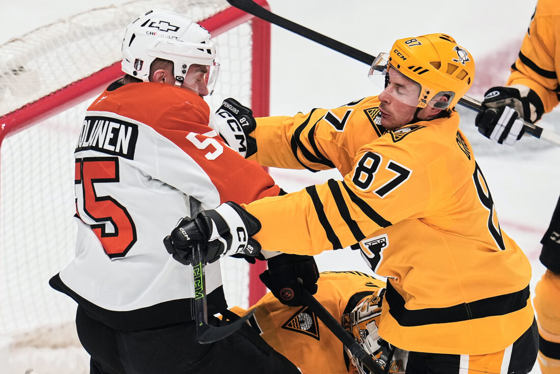 Associated Press TOUGH NIGHT — The Penguins' Sidney Crosby checks the Flyers' Rasmus Ristolainen in front of Penguins goalie Stuart Skinner during the first period of Game 2 in the first round of the NHL Stanley Cup playoffs in Pittsburgh, Monday.