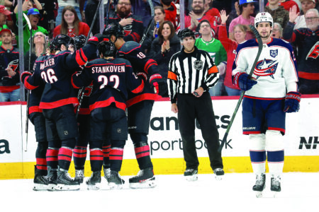 Associated Press The Hurricanes' Logan Stankoven celebrates his goal with teammates as the Blue Jackets' Sean Monahan skates by during the first period of an NHL game in Raleigh, N.C., Thursday.