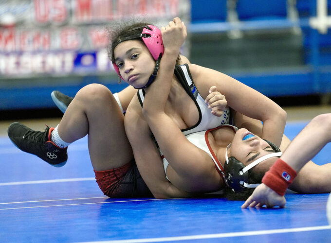 East Liverpool’s Nirayah Monterio gets back points before getting her pin on Steubenville’s Alonna Barbow on Wednesday. East Liverpool won the dual meet 29-6. - Jimmy Joe Savage